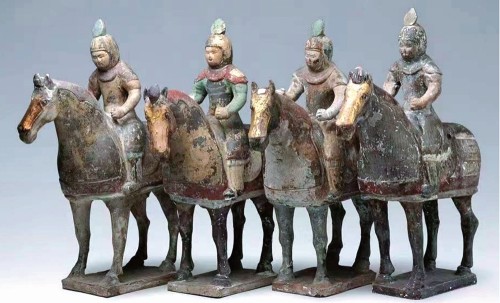 曹操《軍策令》曰:“(袁)本初馬鎧三百具,吾不能有十具。見其少,遂不施也”,可知中國出現(xiàn)人馬俱甲的騎兵武備不晚于東漢末。不過當(dāng)時(shí)中原甲騎具裝很少,似乎沒有在戰(zhàn)爭(zhēng)中發(fā)揮什么作用,馬鎧更多時(shí)候是被當(dāng)作儀仗或賞賜用品。東晉十六國時(shí)期,“五胡”軍隊(duì)中甲騎具裝逐漸開始流行,如前趙劉曜“召公卿已下子弟有勇干者為親御郎”,皆“被甲乘鎧馬”,后伐河西張駿“絕其運(yùn)路”而著大功;東晉名將桓石虔破前秦軍,曾一次繳獲“具裝鎧三百領(lǐng)”,前秦甲騎具裝之盛可見一斑。另外,此期相關(guān)考古發(fā)現(xiàn)也較多,如陜西關(guān)中出土的鎧馬俑、具裝俑,敦煌佛窟以及遼寧北票喇嘛洞出土前燕鐵質(zhì)甲騎具裝實(shí)物等。以上種種表明,甲騎具裝此期在北方割據(jù)混戰(zhàn)中發(fā)揮作用較大,這可能與北方地形以及“五胡”政權(quán)興亡多賴部族精兵有關(guān)。鮮卑拓跋氏統(tǒng)一北方后,北魏仍可依仗甲騎具裝在南北對(duì)峙中保持一定戰(zhàn)術(shù)優(yōu)勢(shì),以至江左常將甲騎具裝直呼為“鮮卑具裝”。