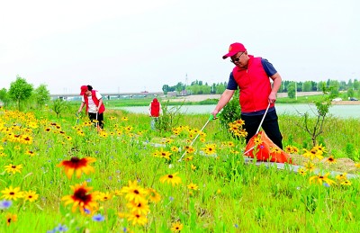 環(huán)保志愿者在河北省石家莊新樂市磁河木刀溝生態(tài)濕地?fù)焓袄。新華社發(fā)