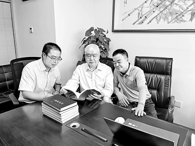 張大可(中)與中國史記研究會副會長丁德科(右)、秘書長丁波研究《史記疏證》編纂工作。丁波供圖