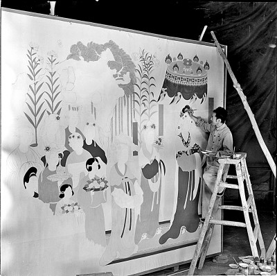 1959年,段文杰在臨摹“都督夫人禮佛圖”。
