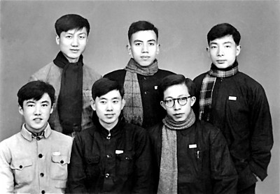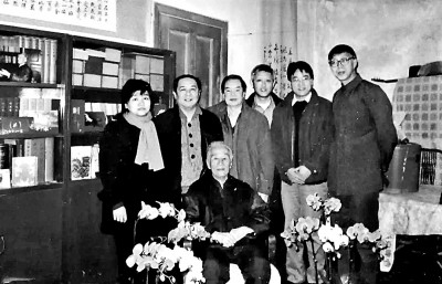 北京大學(xué)中文系教師于迎春、孫玉石、溫儒敏、李小凡、錢志熙、張鳴(后排自左至右)和林庚先生(前)在一起。