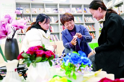 在重慶市北碚區(qū)水土街道萬壽社區(qū)青年夜校,老師指導(dǎo)青年職工學(xué)習(xí)制作絲網(wǎng)花,幫助青年職工豐富文化生活。新華社發(fā)