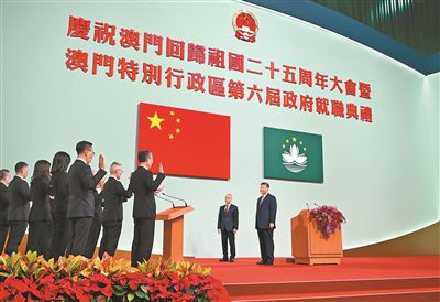 12月20日上午,慶祝澳門回歸祖國25周年大會暨澳門特別行政區(qū)第六屆政府就職典禮在澳門東亞運動會體育館隆重舉行。中共中央總書記、國家主席、中央軍委主席習(xí)近平出席并發(fā)表重要講話。這是習(xí)近平監(jiān)誓,澳門特別行政區(qū)第六屆政府主要官員在澳門特區(qū)第六任行政長官岑浩輝帶領(lǐng)下宣誓就職。