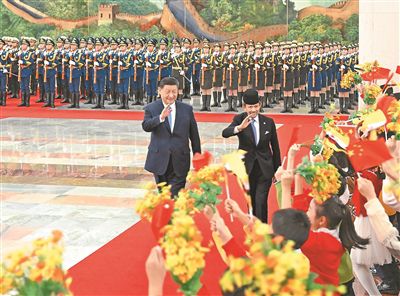 會(huì)談前,習(xí)近平在人民大會(huì)堂北大廳為哈桑納爾舉行歡迎儀式。