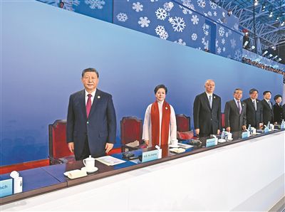 19時(shí)58分,在《和平——命運(yùn)共同體》的樂曲聲中,習(xí)近平和夫人彭麗媛,同國際奧委會主席巴赫、亞奧理事會第一副主席霍震霆等步入主席臺,向觀眾揮手致意。全場響起長時(shí)間的熱烈掌聲。