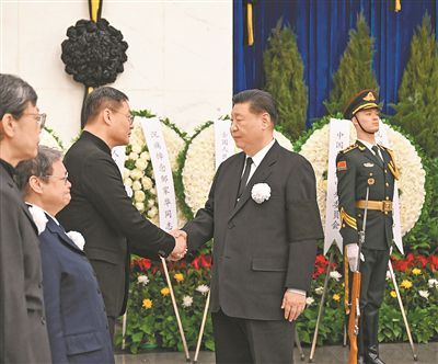 上午9時30分許,習(xí)近平、李強(qiáng)、趙樂際、王滬寧、蔡奇、丁薛祥、李希、韓正等,在哀樂聲中緩步來到鄒家華同志的遺體前肅立默哀,向鄒家華同志的遺體三鞠躬,并與鄒家華同志親屬一一握手,表示慰問。