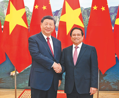 雙方要推進(jìn)高質(zhì)量發(fā)展,為兩國攜手邁向現(xiàn)代化提供堅實戰(zhàn)略支撐。充分發(fā)揮中越陸海相連的區(qū)位優(yōu)勢,加強(qiáng)發(fā)展戰(zhàn)略對接,深挖產(chǎn)業(yè)合作潛能。穩(wěn)步推進(jìn)基礎(chǔ)設(shè)施建設(shè)合作,提升互聯(lián)互通水平,保障貿(mào)易暢通。做大做強(qiáng)貿(mào)易、投資等傳統(tǒng)領(lǐng)域合作,拓展5G、人工智能、清潔能源、數(shù)字經(jīng)濟(jì)等新興產(chǎn)業(yè)合作。堅定維護(hù)多邊貿(mào)易體制,共同推動經(jīng)濟(jì)全球化朝著更加開放、包容、普惠、均衡的方向發(fā)展。