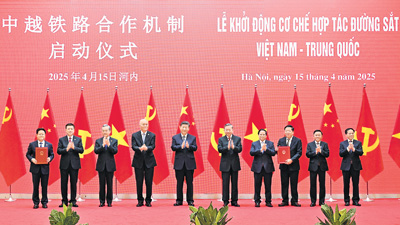 4月15日上午,中共中央總書記、國家主席習(xí)近平在河內(nèi)國際會議中心同越共中央總書記蘇林、越南國家主席梁強共同會見中越人民大聯(lián)歡活動代表。這是活動后,習(xí)近平同蘇林、范明政共同見證中越鐵路合作機制啟動儀式。