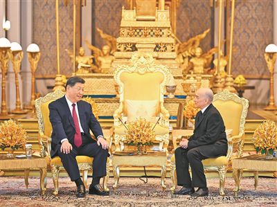 習(xí)近平指出,很高興在西哈莫尼國(guó)王登基20周年和柬歷新年之際應(yīng)邀訪問美麗的柬埔寨,謹(jǐn)向柬埔寨人民致以新年祝福。柬埔寨國(guó)家建設(shè)事業(yè)蒸蒸日上,相信在西哈莫尼國(guó)王庇佑下,勤勞智慧的柬埔寨人民一定能把國(guó)家建設(shè)得更加繁榮富強(qiáng)。