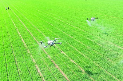 山東省青島市即墨區(qū)段泊嵐鎮(zhèn)瓦戈莊村綠色增糧先行示范區(qū),農(nóng)民采用植保無人機(jī)為小麥噴灑葉面肥。新華社發(fā)