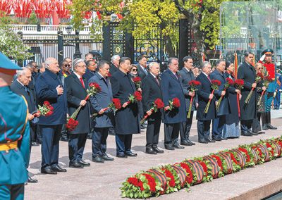 當(dāng)?shù)貢r(shí)間5月9日,俄羅斯舉行盛大慶典,紀(jì)念蘇聯(lián)偉大衛(wèi)國(guó)戰(zhàn)爭(zhēng)勝利80周年。國(guó)家主席習(xí)近平和來自世界20多個(gè)國(guó)家及國(guó)際組織領(lǐng)導(dǎo)人應(yīng)邀出席慶典。慶典結(jié)束后,習(xí)近平同其他國(guó)家領(lǐng)導(dǎo)人一起從紅場(chǎng)來到亞歷山大花園,向無名烈士墓獻(xiàn)花,并肅立默哀。