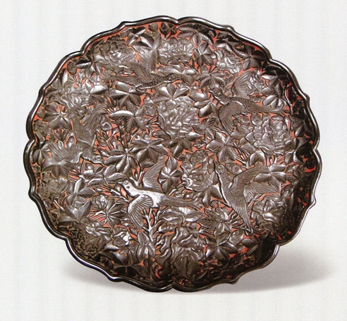 清末民初剔黑芙蓉花五喜鵲八菱形大盤,現(xiàn)藏于日本東京細(xì)川永青文庫。 作者/供圖