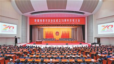 9月25日上午,新疆維吾爾自治區(qū)成立70周年慶祝大會(huì)在新疆人民會(huì)堂隆重舉行。中共中央總書(shū)記、國(guó)家主席、中央軍委主席習(xí)近平出席慶祝大會(huì)。王滬寧、蔡奇出席大會(huì)。