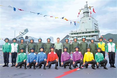 11月5日,我國第一艘電磁彈射型航空母艦福建艦入列授旗儀式在海南三亞某軍港舉行。中共中央總書記、國家主席、中央軍委主席習(xí)近平出席入列授旗儀式并登艦視察。這是習(xí)近平同艦載機飛行員、航空保障人員合影留念。